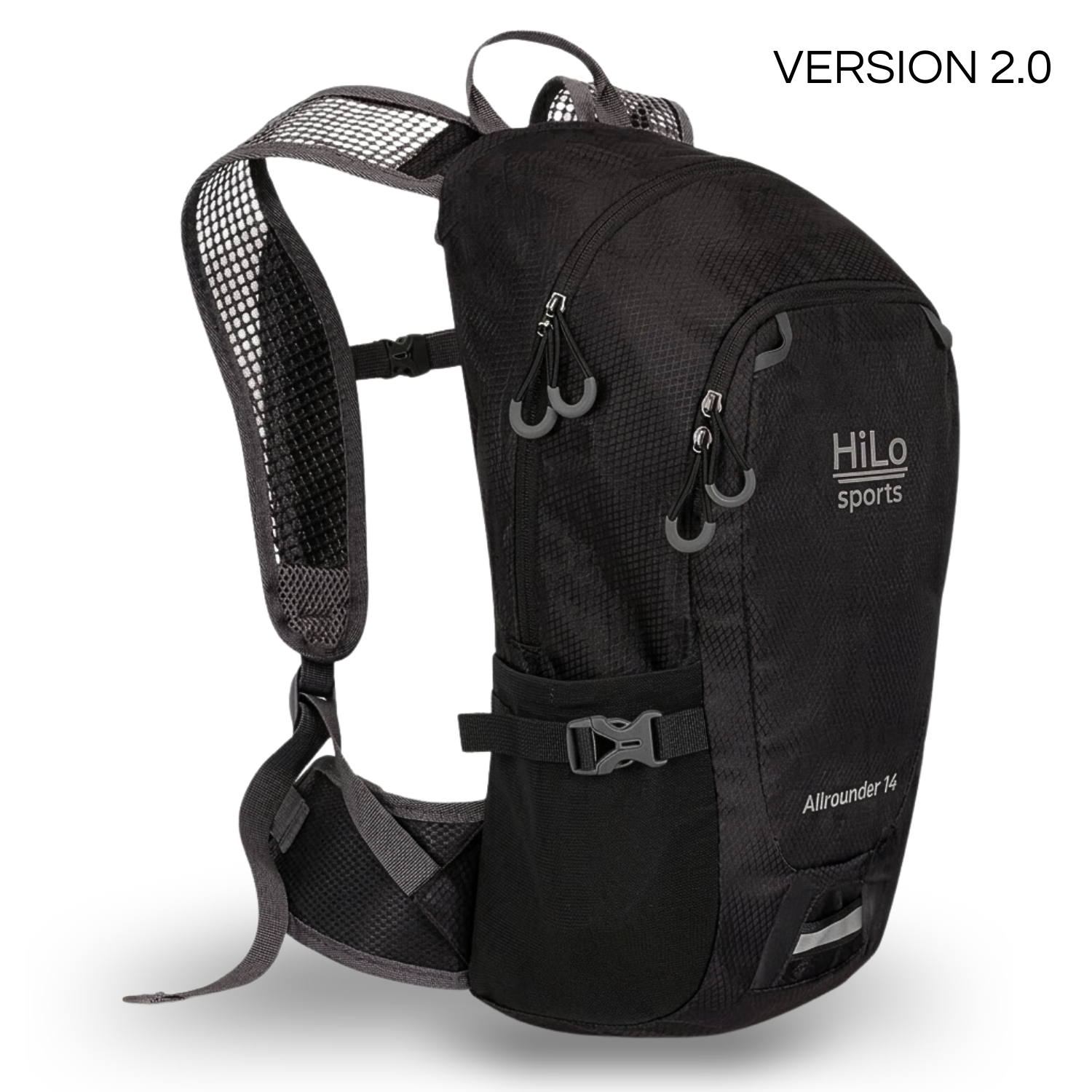 Vorne am Rucksack gibt es eine Befestigungs-Möglichkeit für den Helm. Gerade fürs aufwärts-fahren kann ein Helm Mal lästig sein. Vor allem im Sommer und bei großer Anstrengung wünscht man sich den Helm gerne mal weg. Mit dem Sport Rucksack Allrounder 14 ist das kein Problem. Du kannst du Helm direkt am kleinen Rucksack festbinden. Und das garantiert mit bombenfestem Halt. Durch die 3-Punkt Fixierung hält der Helm fest am Rucksack und ist dir nicht mehr im Weg. Zudem bietet dir der Radrucksack Platz für eine Trinkblase bis zu 2 Liter. Es gibt ein extra Innenfach, in dem du die Trinkblase verstauen kannst. Durch die integrierte Schlauch Öffnung (mit H2O gekennzeichnet) kommt der Trinkschlauch bequem nach außen. Am Träger gibt es eine Befestigung für den Trinkschlauch. Somit kannst du während dem Radfahren jederzeit bequem trinken.